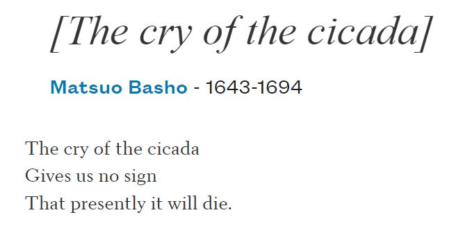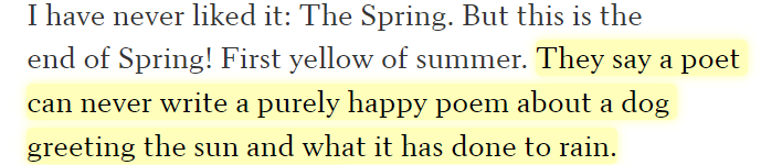 Summer is for listening to the rushing sound of cicadas (cicadas who give us no sign that presently it will die). Summer is for going to the park for walks. Summer is for rolling around in the cool and itchy grass. Summer is for throwing out old toys and chewing up new ones. Summer is for aliveness, no matter how slow it is, and not for being surprised at how much grief you feel over a dog not being able to do any of these summer things anymore. Not for realizing you won’t feel that same ‘joy in the soft butt of a dog disappearing into its daily necessities.’